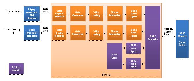 アイウェーブはお客様のビデオ処理アプリケーションをサポートするため、FPGAでビデオ処理ユニットを開発しました。 このユニットはデジタルカメラ(VGA/HDMI)からYcbCr 4:4:4又はRGB 4:4:4 フォーマットのデータを入力して、カラー コンバージョン、ビデオ スケーリング及びクロマ リサンプリング等のビデオ処理を行い、データをDDR2メモリに保存することが可能です。 また、DDRメモリに保存したデータを読み込み、ビデオ処理を行い、VGA/HDMIディスプレーに出力することが可能です。 ブロック図 ビデオ処理ユニット 拡大ブロック図はこちら 機能 1. VGA/HDMIビデオ入力RGB 4:4:4データをキャプチャする。 2. カラー コンバージョンIPを使用して、RGB 4:4:4データをYCbCr 4:4:4データにコンバートする。 次に、クロマ リサンプリングIPを使用して、YCbCr 4:2:0にダウン サンプルする。 (今回のH.264コーデックはYCbCr 4:2:0のデータフォーマットのみサポートしているため) 3. イメージ処理を行いデータをDDRメモリに保存する。 4. DDRメモリに保存しているデータをH.264 Codecユニットを使用して、リードし、Encodeし、DDR メモリに保存する。 5. 次に、H.264 Codecユニットを使用して、エンコーディングしているデータをリードし、デコーデイング し、DDRメモリに保存する。 ユーザは、DDRメモリに保存している下記のデータから1つを読み出し、イメージ処理を行い、 VGA/HDMIで出力することが可能です。 1. VGA/HDMIビデオデータ 2. H.264 エンコードされたデータ 3. H.264 デコードされたデータ 上記のデータはDDRメモリの個別のデータバッファに保存されます。 仕様 ・ ビデオ キャプチャ/表示インタフェース ・ 24-ビット データ V/H シンクロ及びクロック ・ 4:4:4 YCbCr又はRGBデータ ・ プログラマブル解像度(最小QCIF (176x144)から最大HD (1920x1080)) ・ プログラマバル インタフェース タイミング (前部及び後部ポーチ) ・ カラー コンバージョン ・ RGB から YCbCr ・ YCbCr から RGB ・ ビデオ スケーリング ・ 0から4までのファクターでのアップ スケーリングとダウン スケーリング ・ 水平方向と垂直方向で5-tap補間フィルタ ・ クロマ リサンプリング ・ ダウン サンプル 4:4:4 から 4:2:0 ・ アップ サンプル 4:2:2 から 4:4:4 ・ DDR2ライト/リード エージェント ・ DDR2コントローラへのインタフェース ・ DDR2コントローラ ・ H.264 Codecユニット(サードパーティ製をご用意しています) ・ DDR2ライト/リード エージェント ・ H.264 CodecユニットとDDR2コントローラのインタフェース アプリケーション ・ テレビ電話 ・ デジタルサイネージ ・ 画像処理装置 ・ 家庭用、エンターテインメント用、工業用、自動車用でLCDを使用するあらゆる用途 ・ ビデオ監視・観測システム及びあらゆるビデオ処理システムで使用可能 特徴 ・ SOCへの移行が容易 ・ コンフィギュラブル ・ 多くのFPGAファミリーにおけるインテグレーションが容易な簡単設計 詳細はビデオ処理ユニットへ