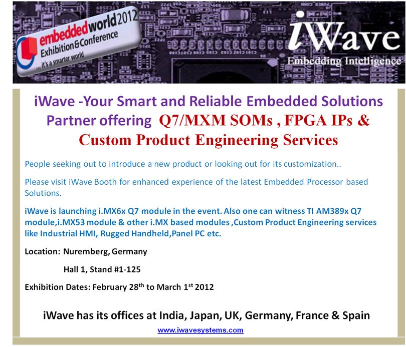 アイウェーブはドイツ Nurembergで2012年2月28日から3月1日に開催されるEmbedded World 2012にi.MX6x Q7モジュールを出展します。 この他にも、TI AM389xモジュール、i.MX53モジュール、各種i.MXモジュール、カスタム品(産業用HMI、堅牢型携帯端末、パネルPC等)を出展します。 i.MX 6 Series Introduction & Overview (PDF) アイウェーブはQseven Consortiumのmemberです。 (Qsevenホームページ左欄のQseven Membersをクリックしてください。) Qseven仕様Rev1.11(英語) (Qsevenホームページ左欄のQseven Specificationをクリックしてください。) Qseven仕様Rev1.11(日本語、PDF) 詳しくは、営業にお問い合わせください。 プレスリリーストップへ