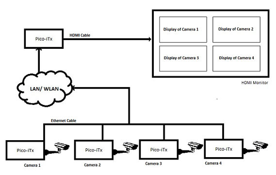 i.MX6が登場して、監視用アプリケーションの向上が図られています。 アイウェーブは、4ヵ所の異なる場所に設置されたi.MX6 Pico ITX SBCのカメラから動画をEthernet 経由でストリーミングし、1ヵ所で映し出すシステムを開発しました。 図の上方にあるPico ITX は、Ethernet 経由のビデオをキャプチャして、1台のHDMIモニターに表示します。 システムは、LAN接続された5台のi.MX6 Dual Pico-ITX ボードで構成されています。 4台のボードにはカメラが接続されており、動画を撮影し、エンコードしてRTPパケットとしてストリーミングします。 5台目のボードは、4つのRTPパケットストリームを受信して、HDMIの4つのスロットに表示します。 使用したOS は、Dora VersionのYoctoでした。 ビデオキャプチャにはMIPI 又はCSIカメラが使用できます。 (テストは5MP MIPIカメラで実施) 4つのカメラは、均等に画面をシェアし、その解像度は854x480です。 デモンストレーション用に、我々は1台のカメラに1台のPico-ITXを使用いたしましたが、コストを節約するためには1台のi.MX6 Pico-ITX SBCに2台のカメラを接続することも可能です。 i.MX6 Quad/Dualコアを備えたPico-ITXは、2台のカメラから同時に画像をキャプチャすることが可能です。 i.MX6 Pico ITX SBCパンフレット(PDF)