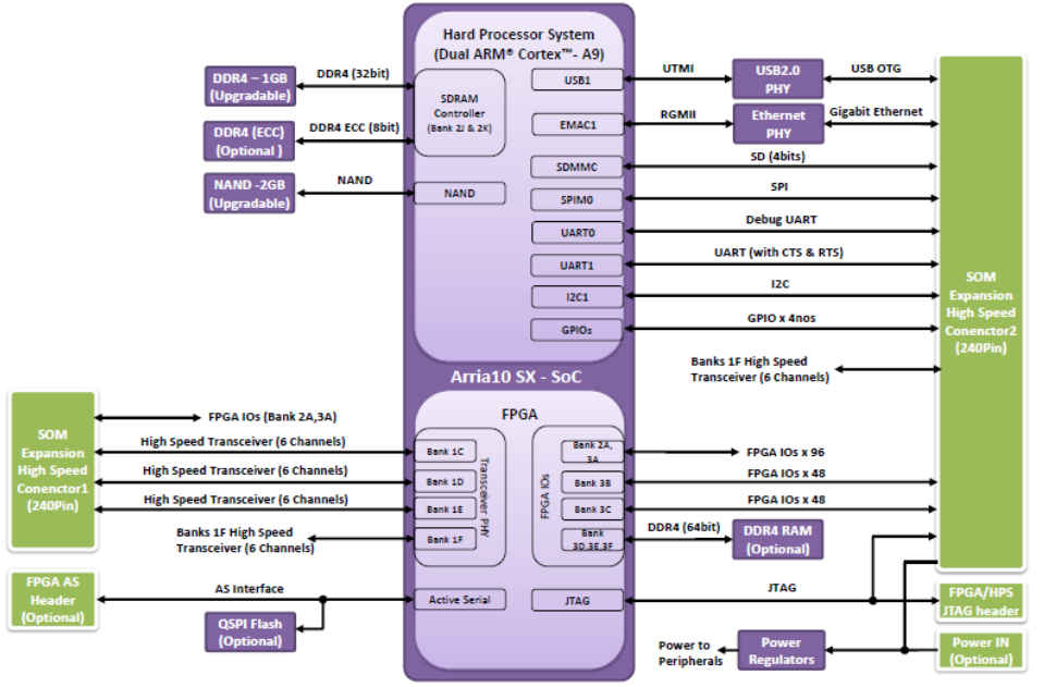 アイウェーブはAltera社のArria 10 SoCを使用したSOMの発売を計画中です。 このSOMはアイウェーブのFPGA SoC SOMロードマップにおいて、Cyclone V SoC SOMに続くものです。 Arria 10 SoCは電力、形状、コストを削減しつつ性能の向上を達成しており、インフラストラクチャ・インテリジェント装置、テスト・測定装置、医療画像装置、ストレージおよび放送等の性能を重視するアプリケーション向けに最適です。 Arria 10 SOC SOMはArria 10 SXファミリーデバイスをベースにしており、F34パッケージに収められています。 モジュールはHPS(Hard Processor System)サポート用にECCを備えた32-bit DDR4メモリ(オプショナル)及びFPGAサポート用に64-bit DDR4(オプショナル)を装備しています。 全てのIOおよび高速送受信ブロックはSOMボード上でボードコネクタに接続されます。 Arria10 SoC SOM ブロック図 Arria 10 SOCには高性能のプログラマブル デュアルコアARM Cortex A9 MP Coreハード・プロセッサ・システム(HPS)が組み込まれています。 Arria 10 SOCは高度にインテグレートされたパッケージの中に、組み込みペリフェラル、ハード化された浮動小数点演算子、可変精度デジタル信号処理ブロック、高速トランシーバ、ハード・メモリ・コントローラおよびElliptic Curveデジタル署名アルゴリズムおよび最新暗号化標準を使ったセキュアなブート機能、およびプロトコル知的所有権コントローラ等の様々な機能を持ったプロセッサを提供します。 プレスリリーストップへ