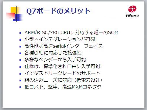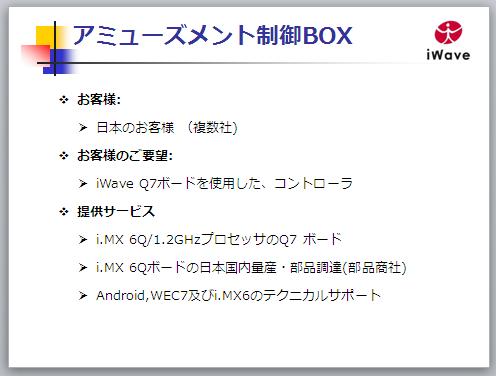 アイウェーブは、 日本のお客様の要求によりiWave Q7ボードを使用したアミューズメント用コントローラを開発・量産化しました。 お客様は、i.MX6 Q7ボードの持つ性能面、コスト面、システム開発の容易性等のメリットを高く評価されて、アミューズメントコントローラ用に選定されました。 1.i.MX6xシリーズのメリット i.MXシリーズの技術資産の活用が可能、高いコスト・パフォーマンス、最適CPUコアの選択、 高いグラフィック能力、多様なI/O、パワーマネジメント等 2.Q7ボードのメリット ARM/RISC/x86 CPUに対応する唯一のSOMスタンダード、小型でインテグレーションが容易、 高性能な高速serialインターフェイス、各種CPUに対応した拡張性、多様なベンダーから入手可能、 仕様は標準化され自由に入手可能、インダストリーグレードのサポート、組み込みニーズに対応 (低電力設計)、低コスト、堅牢、高速MXMコネクタ アイウェーブは、i.MX 6Q/1.2GHzプロセッサのQ7 ボード提供、i.MX 6Qボードの日本国内量産・部品調達(部品商社)、Android,WEC7及びi.MX6のテクニカルサポートを担当し、アミューズメント用コントローラの開発・量産化しました。 アイウェーブは、お客様の様々なご要求に対応して、最適のシステムを短期間に実現、カスタマイズできる実績と体制を持っていますので、お気軽にご相談ください。